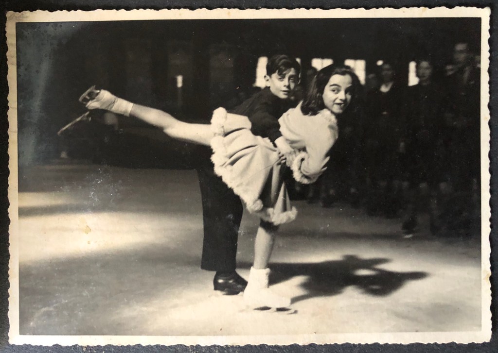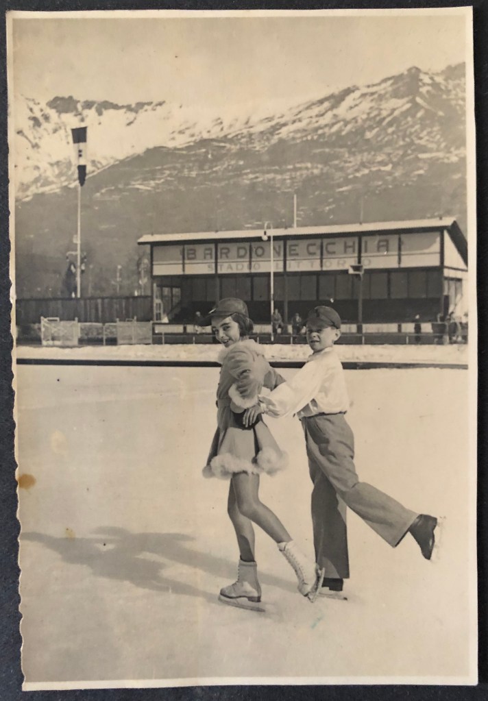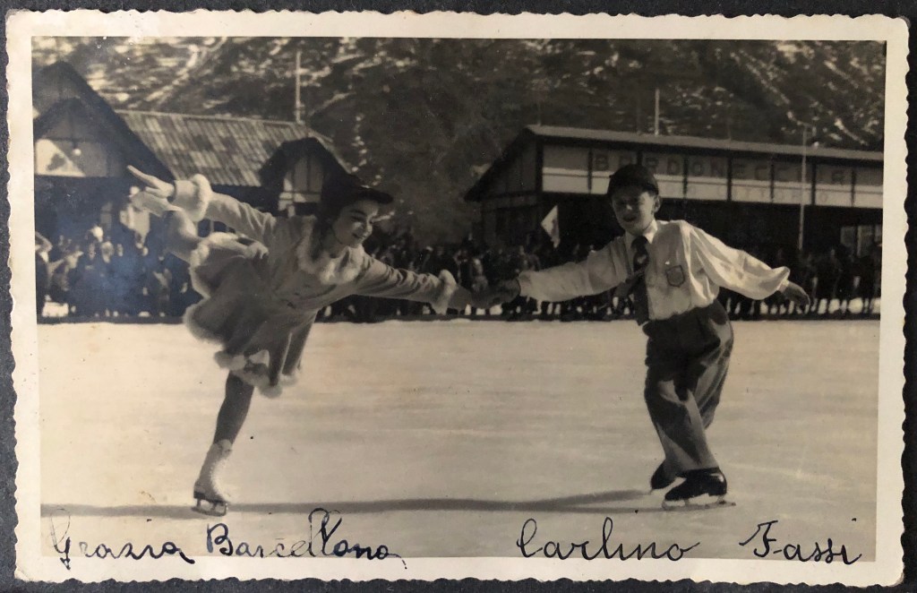 Nel primo scatto, proveniente da Como, vediamo una Grazia particolarmente piccola (come denunciato dal grande fiocco da bambina portato fra i capelli) e un Carlo con un cravattino nero. Alle loro spalle, sulla destra, due pattinatrici sedute, e il maestro Burghardt in piedi: