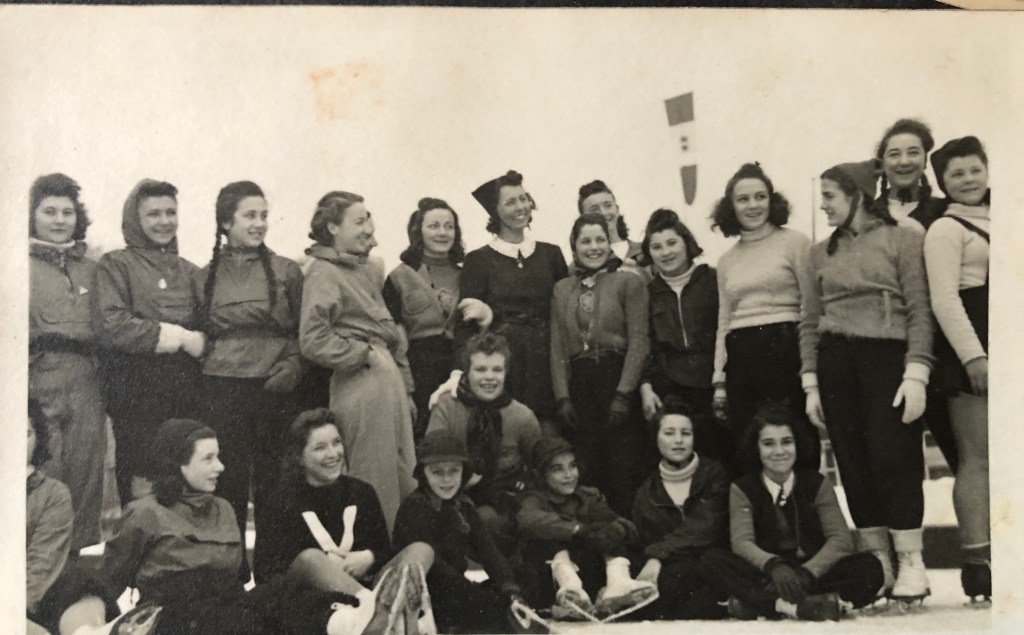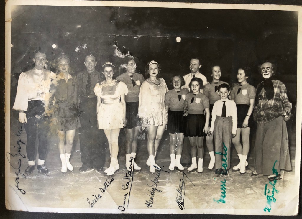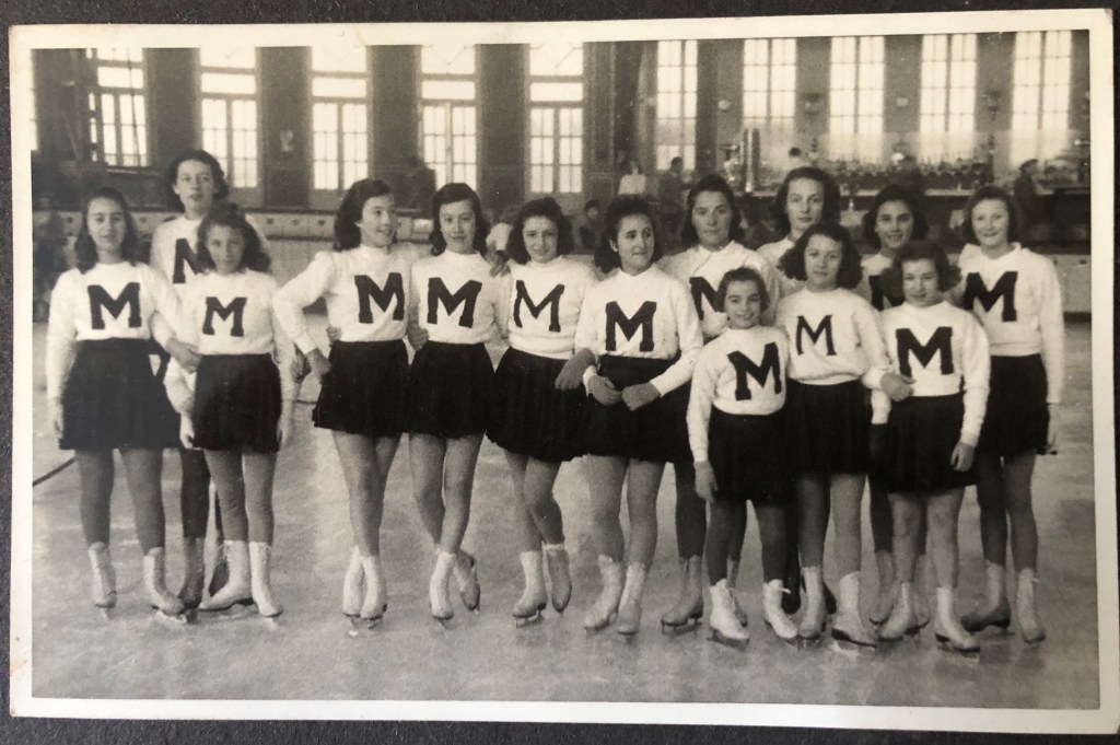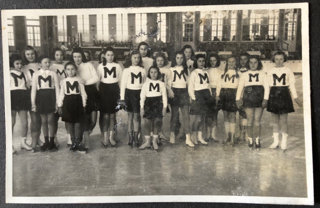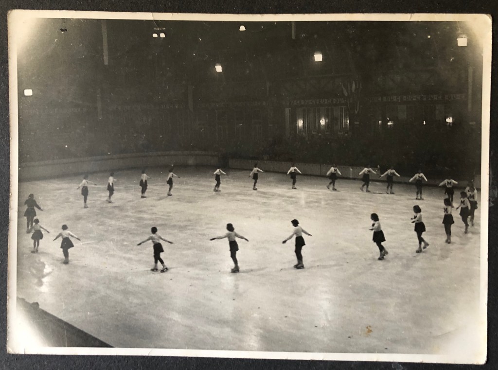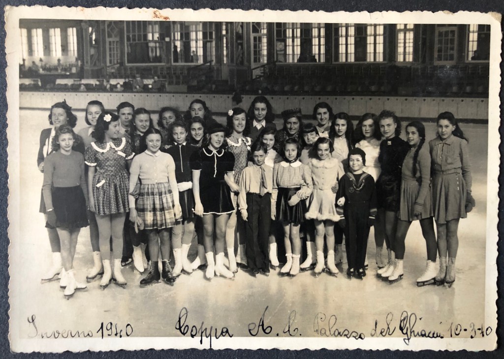 Nella seconda foto vediamo 9 pattinatrici, e 2 pattinatori. Grazia è nell’angolo a destra, Carlino, con la felpa pellicciata già vista in un altro scatto (che, a questo punto, potrebbe essere datato al 1941), è il bambino al centro della foto.