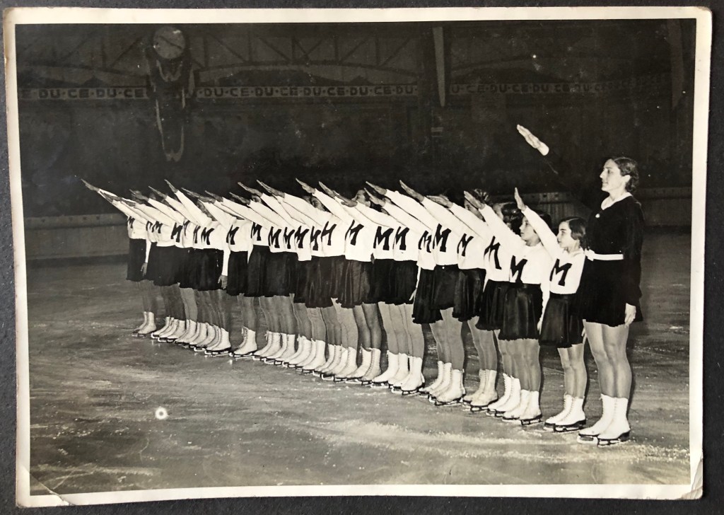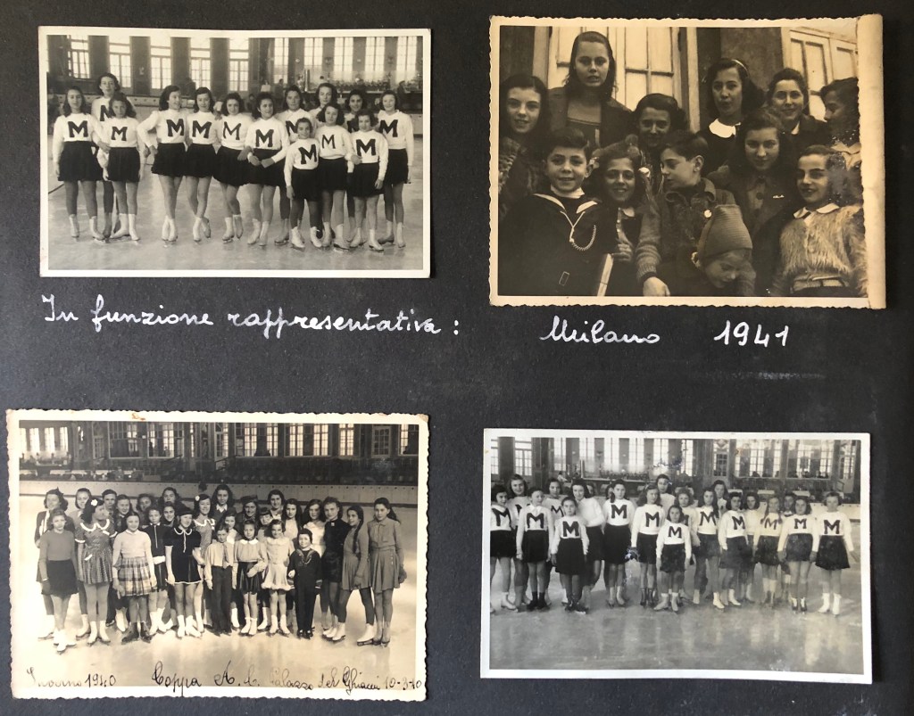 La prima grande foto immortala una scena del saggio finale del 1941 della GIL di Milano, le cui pattinatrici erano state preparate da Anna Dubini Cattaneo, nella foto a sinistra, che apre la fila divenuta ormai cerchio.
