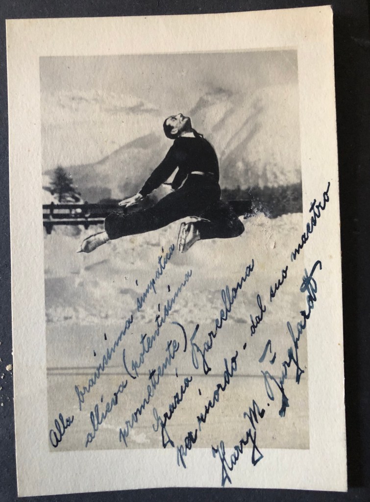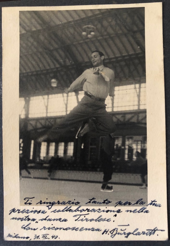Prima di tutto troviamo una foto autografata di Harry Burghardt, che il 31 marzo 1940 scrive così a Grazia: “Ti ringrazio tanto per la tua preziosa collaborazione nella nostra “danza Tirolese”. Con riconoscenza, | Harry Burghardt”. Si trattava di un numero che spesso il maestro tedesco faceva fare alle proprie allieve (sappiamo ad esempio che ciò accadde il 12 febbraio 1941, in occasione dell’esibizione presso il Palazzo del Ghiaccio di Maxie Herber e di Ernst Baier), e che Grazia continuerà a mettere in scena anche dopo (ad es. nel 1952 a Sestriere).