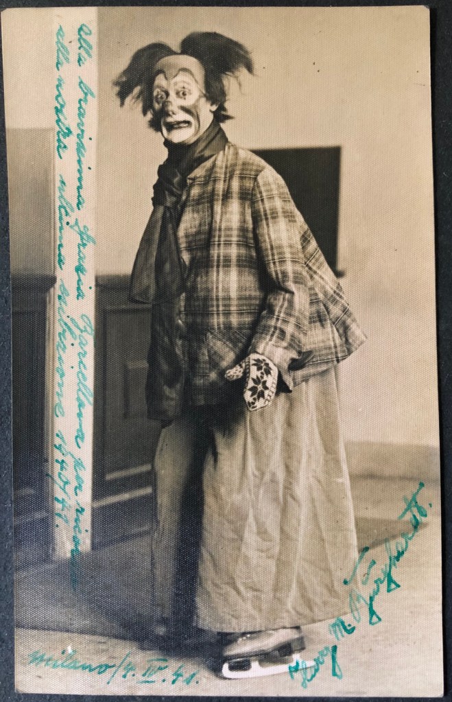 Nella prima foto vediamo Harry Burghardt travestito da pagliaccio, con la seguente dedica: “Alla bravissima Grazia Barcellona[,] per ricordo alla nostra ultima esibizione 1940/41 | Milano 4.IV.41 | Harry M. Burghardt”.