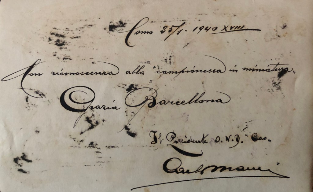 È poi il turno di una foto autografata di Anna Dubini Cattaneo, prima maestra di Grazia, che dedica “a Grazia con molto affetto | Anna Cattaneo Dubini | Inverno 1939 | A. XVII” (partendo l’anno XVII dell’era fascista dal 28 ottobre 1939, sarà da intendere come inverno 1939/1940):