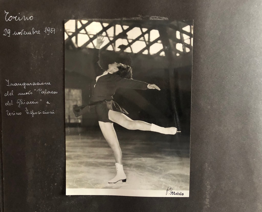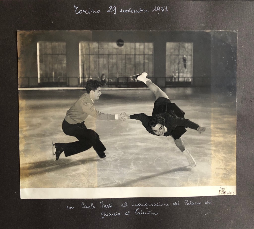 La foto che occupa tutta la pagina è stata scattata a Torino il 29 novembre 1951, in occasione dell’inaugurazione di una pista per pattinatori al coperto, all’interno di Torino Esposizioni (non si tratta dell’attuale Palasport Tazzoli):