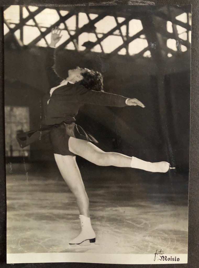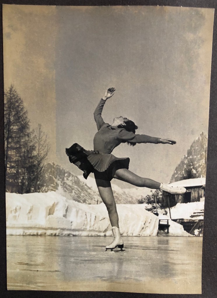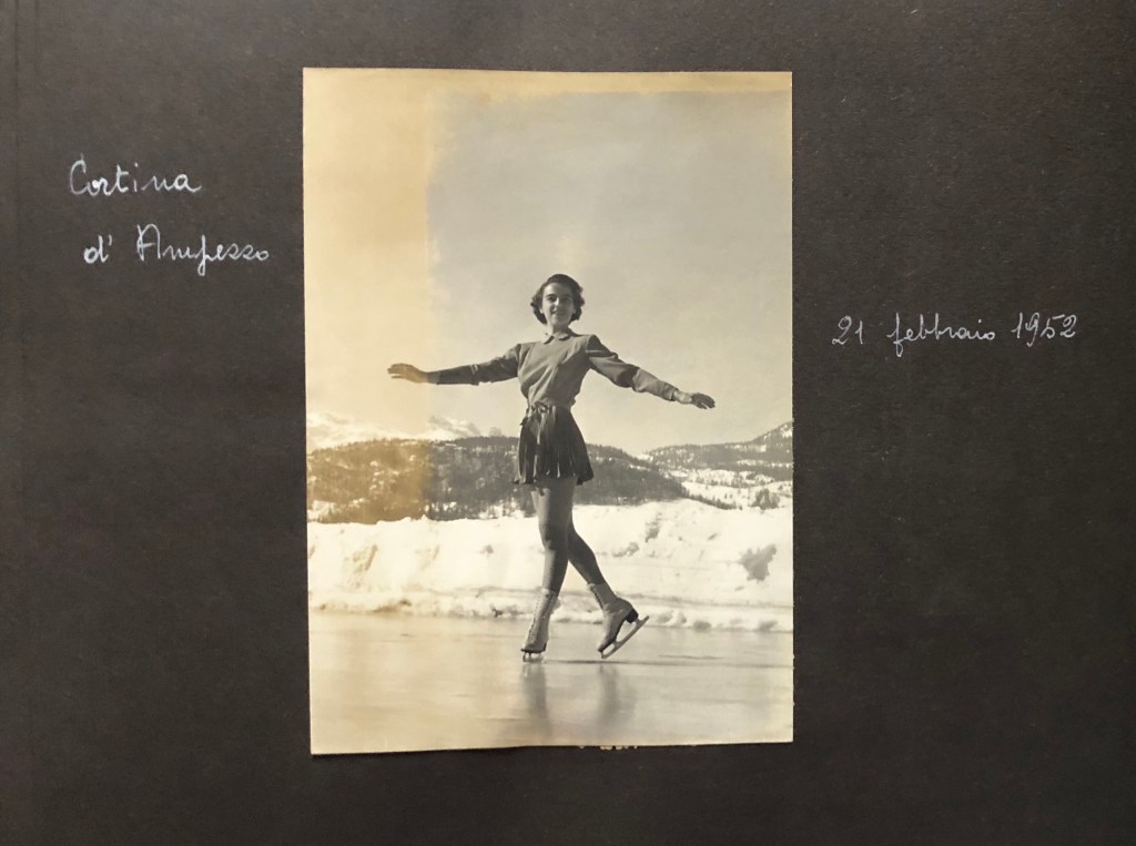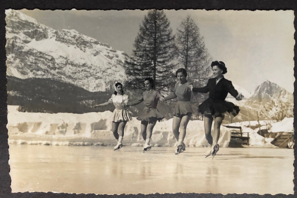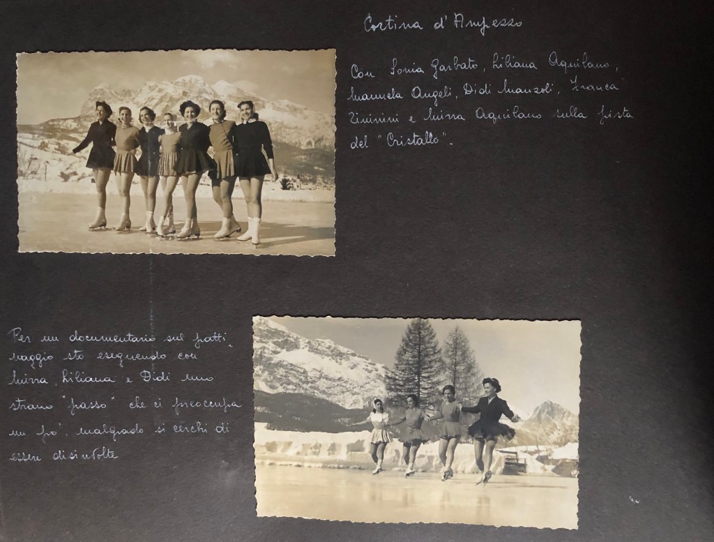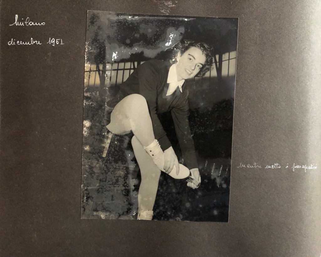 La didascalia della successiva foto ci spiega bene cosa sta succedendo: “Per un documentario sul pattinaggio sto eseguendo con Mirra, Liliana e Didi uno strano “passo” che ci preoccupa un po’, malgrado si cerchi di essere disinvolte”.