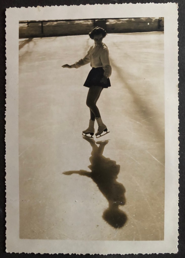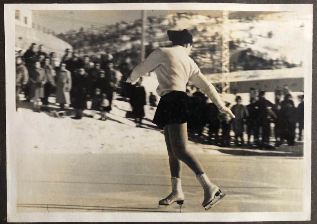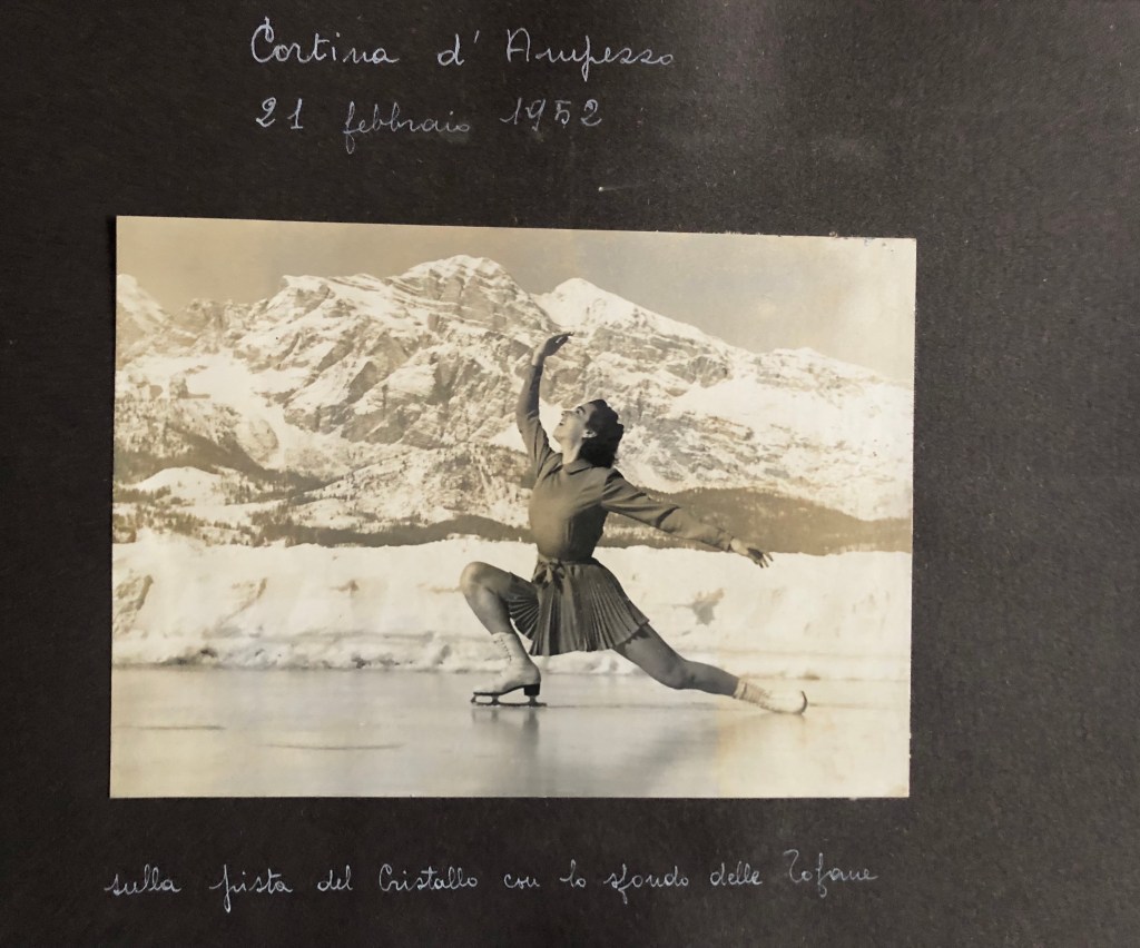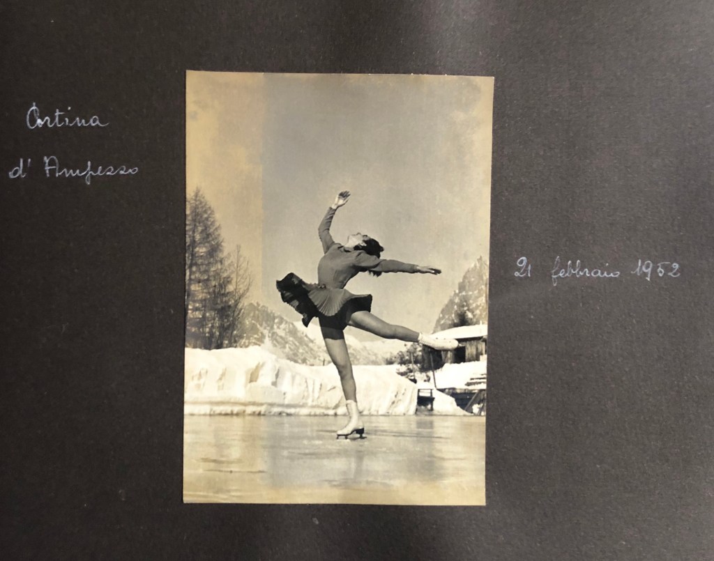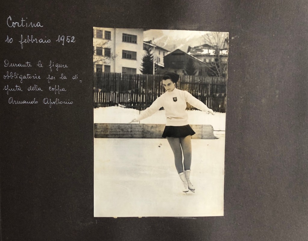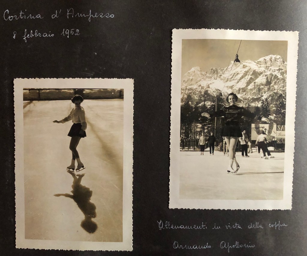 La didascalia della successiva foto ci spiega bene cosa sta succedendo: “Per un documentario sul pattinaggio sto eseguendo con Mirra, Liliana e Didi uno strano “passo” che ci preoccupa un po’, malgrado si cerchi di essere disinvolte”.