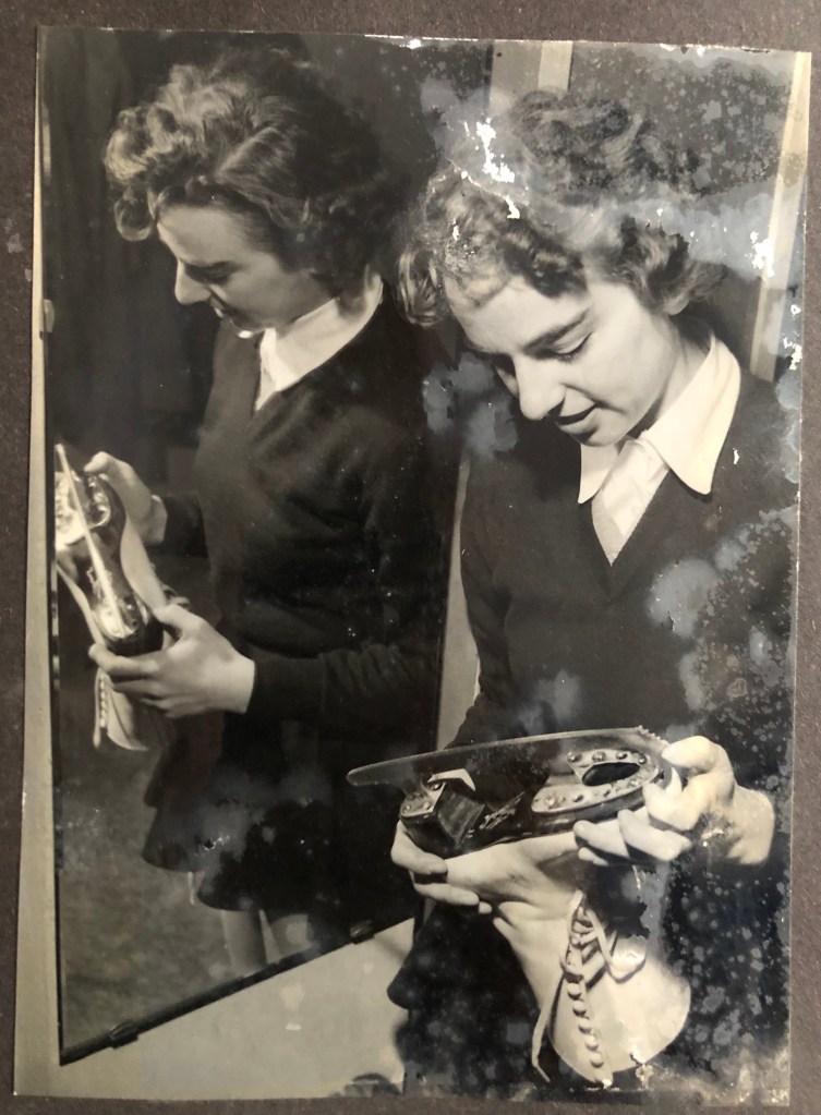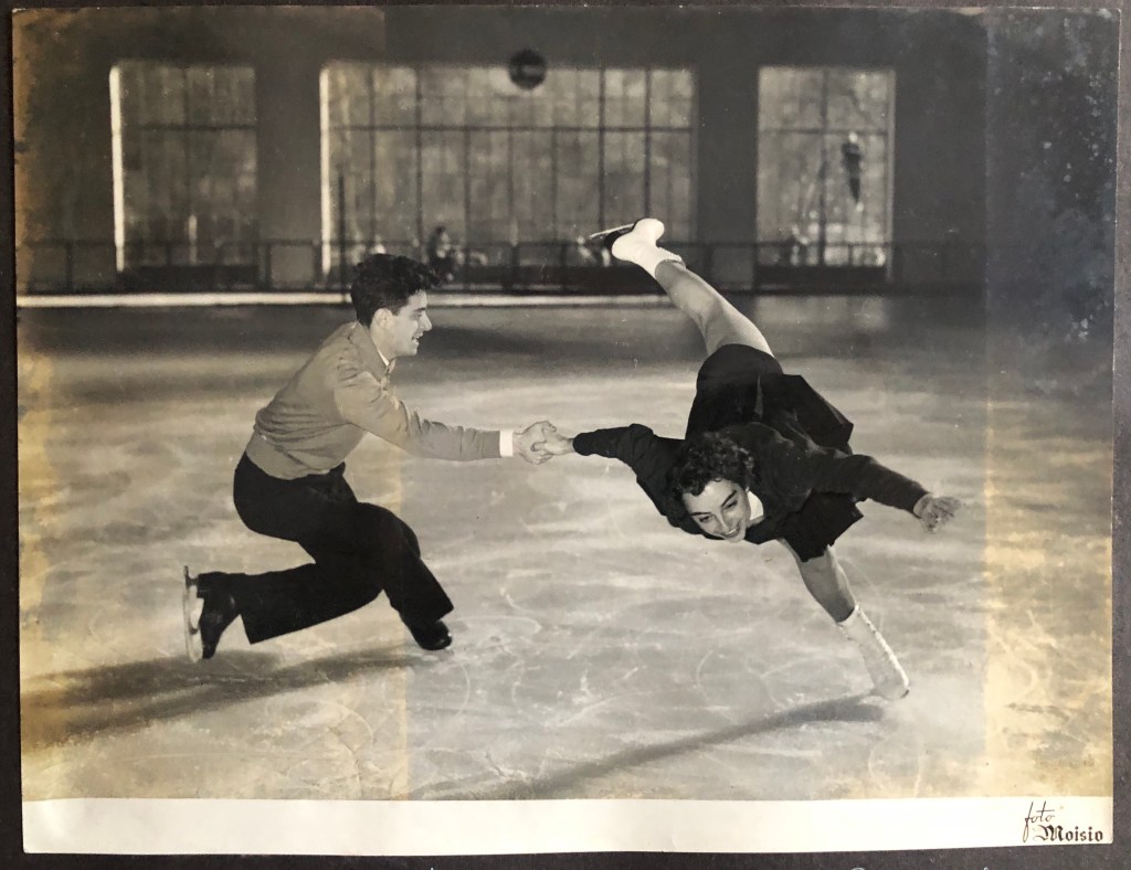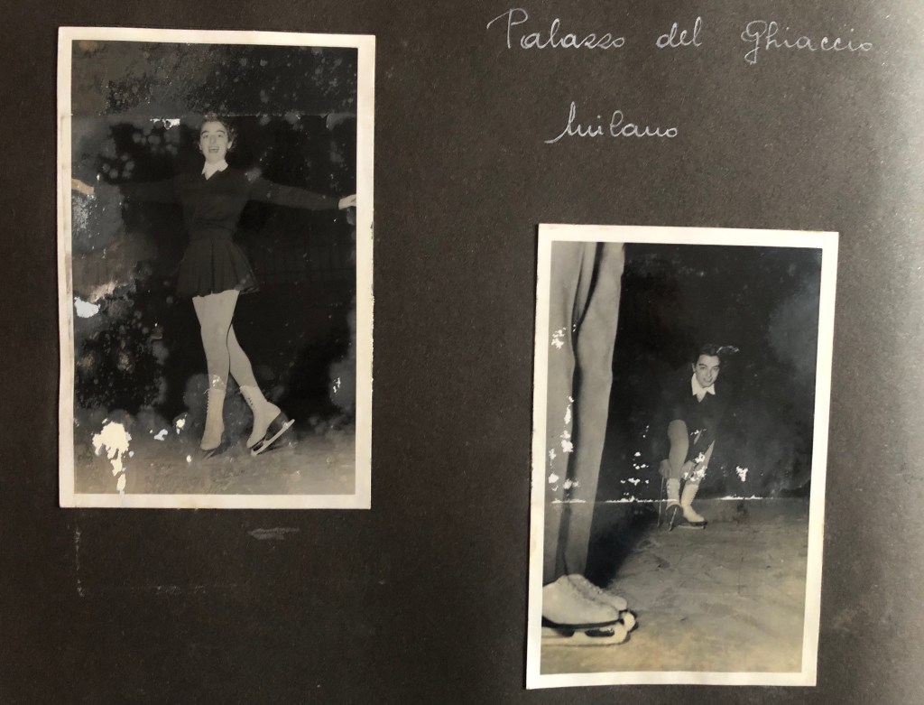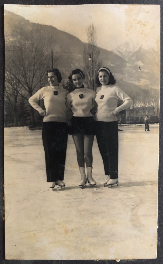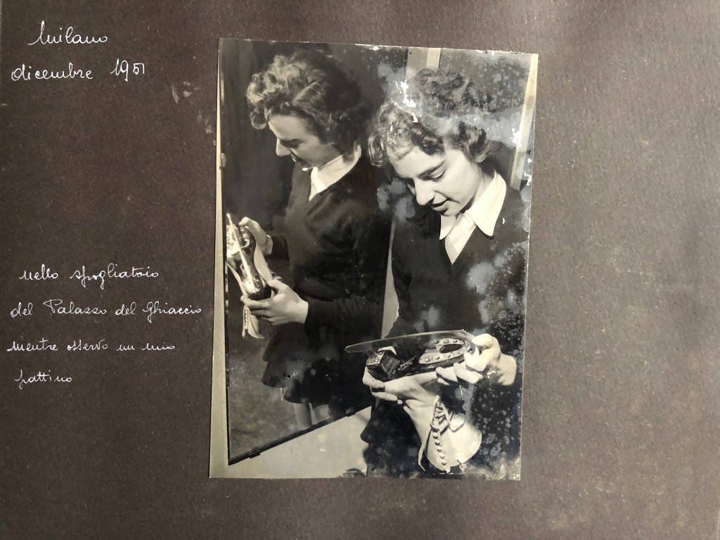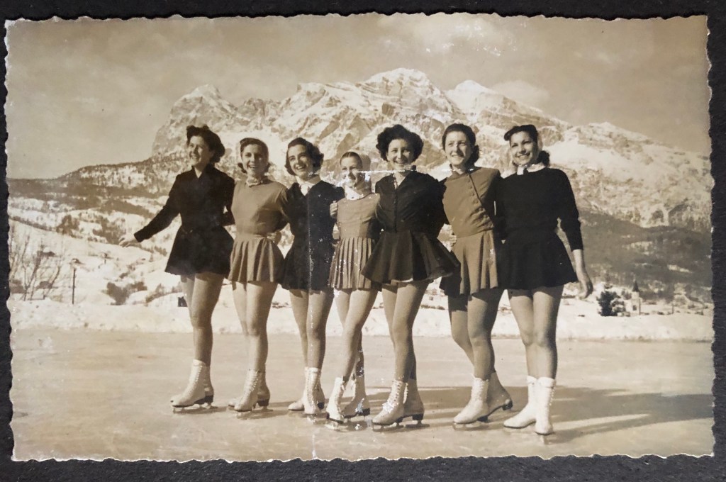 La prima delle due foto immortala 7 pattinatrici milanesi: Sonia Garbato, Liliana Aquilano, Sylvia “Didì” Manzoli, Grazia Barcellona, Manuela Angeli, Franca Tininini e Mirra Aquilano.