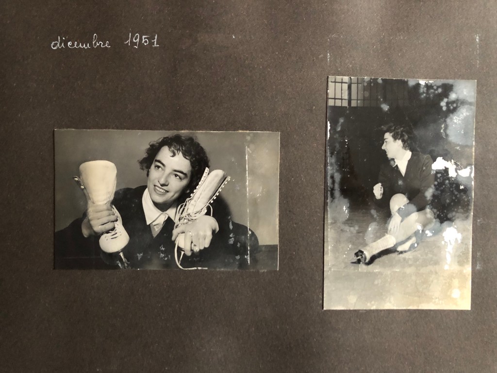 Con la pagina 37 passiamo al dicembre 1951, e ci spostiamo al Palazzo del Ghiaccio di Milano, dove Grazia si fa fotografare probabilmente dalla stampa, che ci possiamo immaginare interessata ad avere sue foto spendibili qualora venga convocata per le imminenti Olimpiadi invernali di Oslo 1952 (cosa che poi non accadrà). Ciò spiegherebbe gli scatti abbastanza insoliti ed evidentemente in prosa, tesi a mostrare al grande pubblico la pattinatrice all’opera nel suo ambiente naturale: