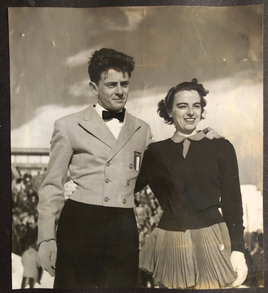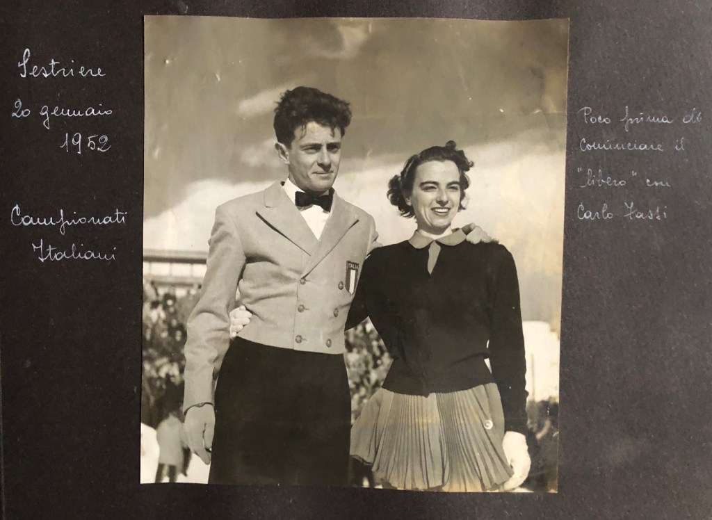 Nella pagina seguente troviamo una foto di Carlo Fassi e Grazia Barcellona che potrebbe farci cadere in errore, visto che parrebbe ritrarre Grazia “poco prima di cominciare il “libero” con Carlo Fassi”. Bisognerebbe aggiungere una virgola dopo “libero”, giacché Grazia e Carlo quell’anno, per la prima volta, non gareggiarono nella prova a coppie. La didascalia sarà allora da intendere nel senso che Carlo e Grazia posarono insieme prima di svolgere il proprio rispettivo libero nell’individuale maschile e in quello femminile. Il video superstite di entrambe le prove in effetti li immortala uno con la giacchetta stretta dotata di tricolore già vista in occasione dell’inaugurazione torinese, eli con un vestito chiaro coperto da un golfino nero per ripararsi dalla bassissima temperatura di quel giorno.