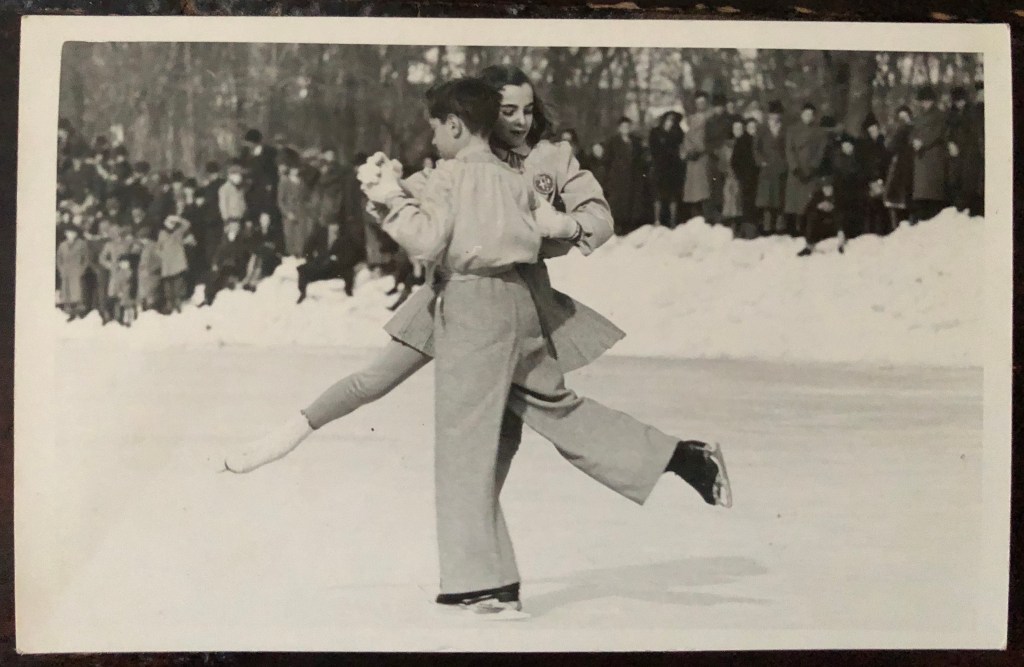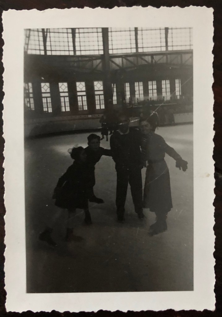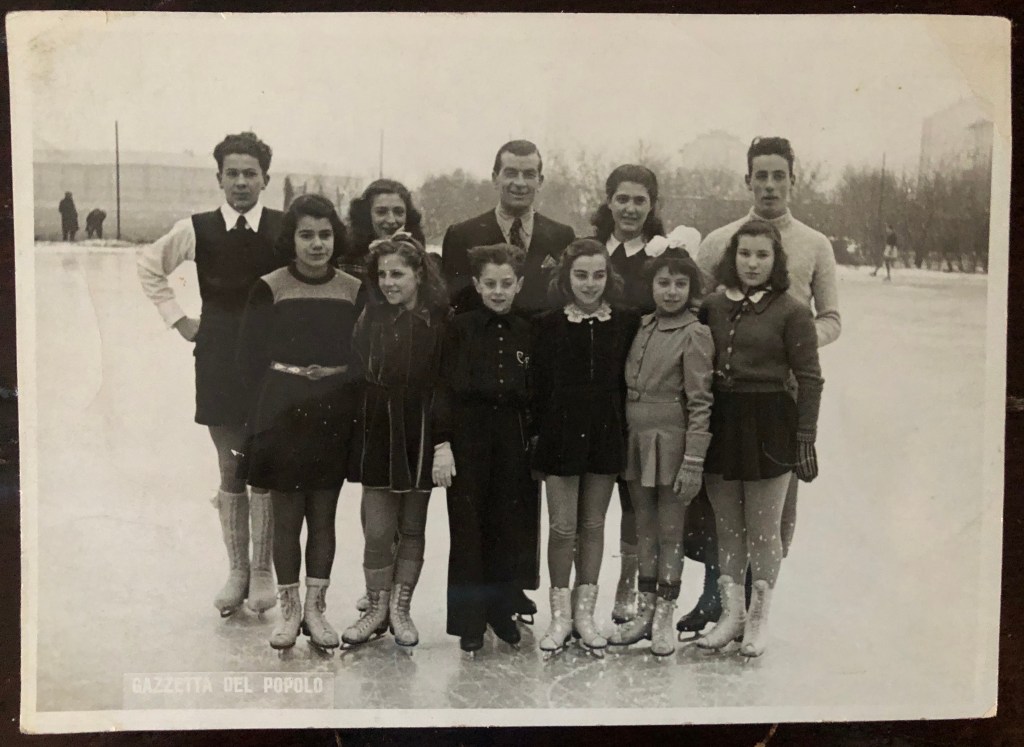 Nella foto successiva vediamo Grazia e Giacomo pattinare con due adulti. I due bambini appaiono della stessa età, o leggermente più grandi della foto precedente: potremmo essere attorno al 1935 (anno più, anno meno). La giovane donna è molto probabilmente Francesca Boccalini, figlia dello zio Mario e quindi cugina dei bambini (ma di fatto, una specie di zia aggiunta). Il volto dell’uomo purtroppo è rovinato da una graffiatura, ma potrebbe essere Ettore Archinti, che sappiamo introdusse Grazia Barcellona all’ambiente del Palazzo del Ghiaccio di Milano.