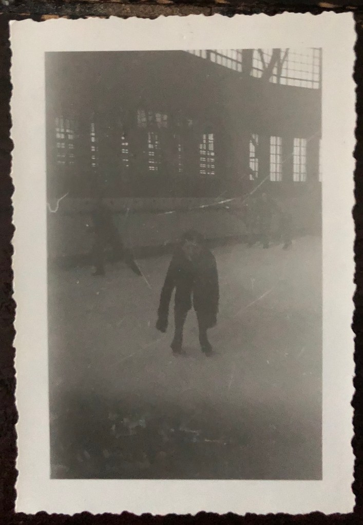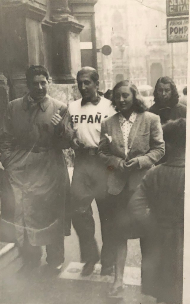 Con la decima foto torniamo a prima del 1943, anno della morte di Giacomo “Popi” Barcellona, che sappiamo dal santino essere stato un appassionato di sport: 1° da sinistra, passeggia in impermeabile per Via dei Mercanti (sullo sfondo, il Duomo di Milano), parlando con un uomo che indossa una felpa con scritto “ESPAÑA”. Di fianco, una ragazza, ed un’altra dietro di loro. Vista l’imponenza del fisico di Giacomo, dobbiamo trovarci durante gli anni della guerra, durante i quali alcuni sportivi spagnoli (la foggia della felpa pare sportiva) in effetti passarono per Milano. Proprio a causa dell’abbigliamento non dovrebbe trattarsi dei falangisti che nel 1942 parteciparono ai Campionati della Gioventù Europea, i quali avevano tutt’altra uniforme. Si ricordi piuttosto che il 19 aprile 1942, a Milano, si disputò l’amichevole di calcio Italia – Spagna (4-0): lo sportivo ritratto potrebbe quindi essere un calciatore iberico.