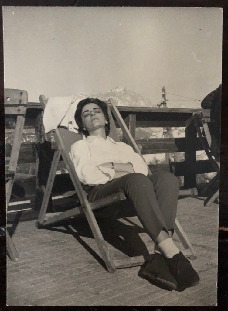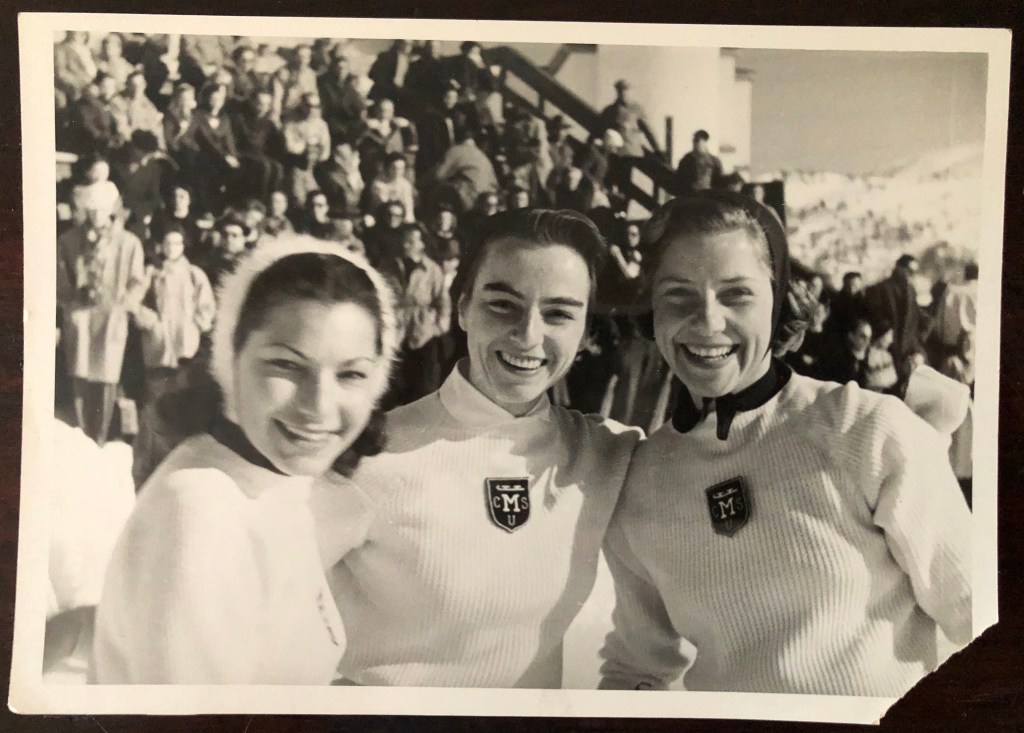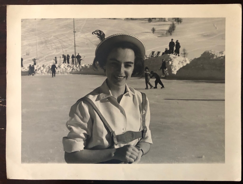 Nella seconda Grazia sorride assieme a due donne all’interno dello Stadio Olimpico del Ghiaccio di Cortina, inaugurato a fine 1955. La foto potrebbe essere stata scattata alle Olimpiadi di Cortina 1956, a cui Grazia partecipò lavorando nella Segreteria, retta da Bruno Bonfiglio.
