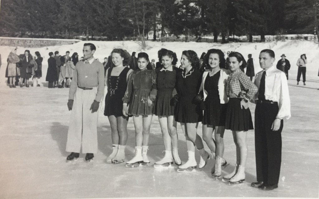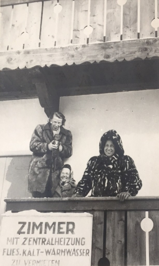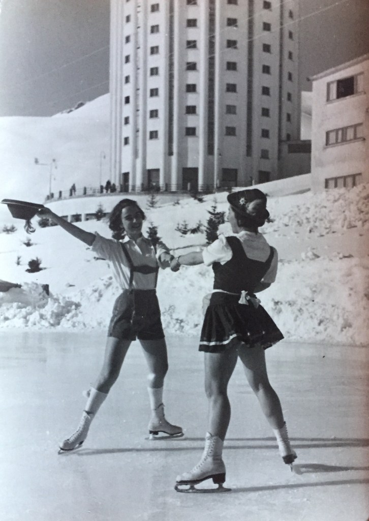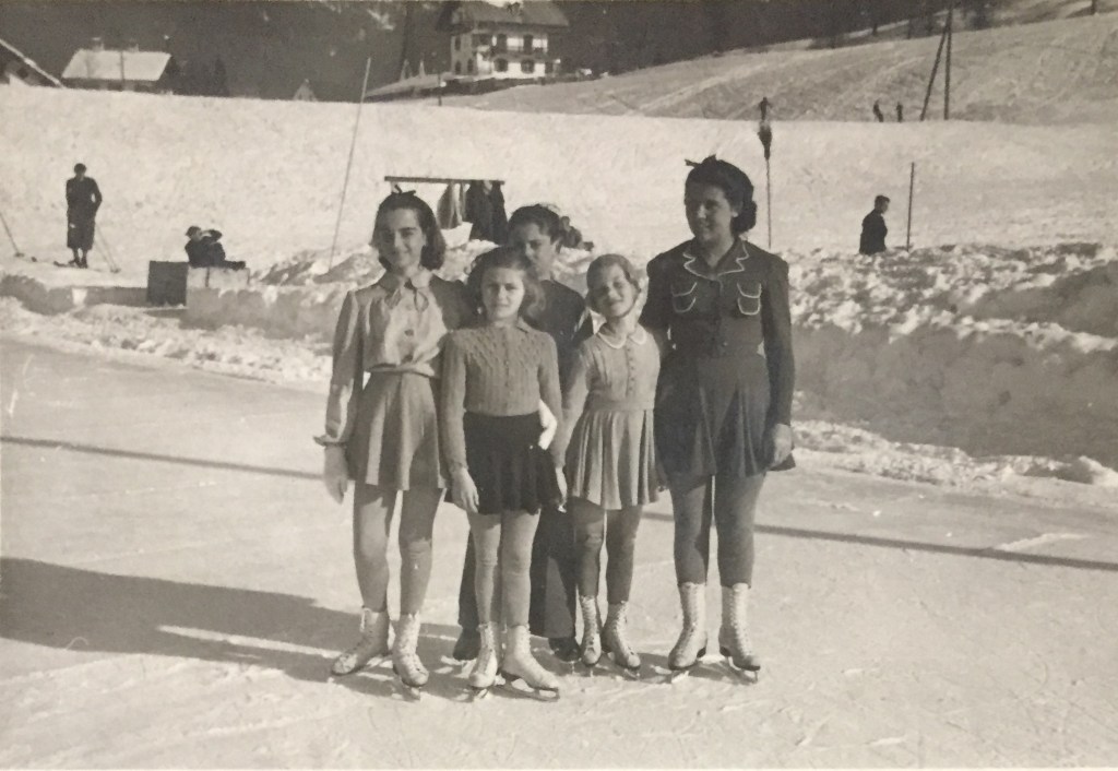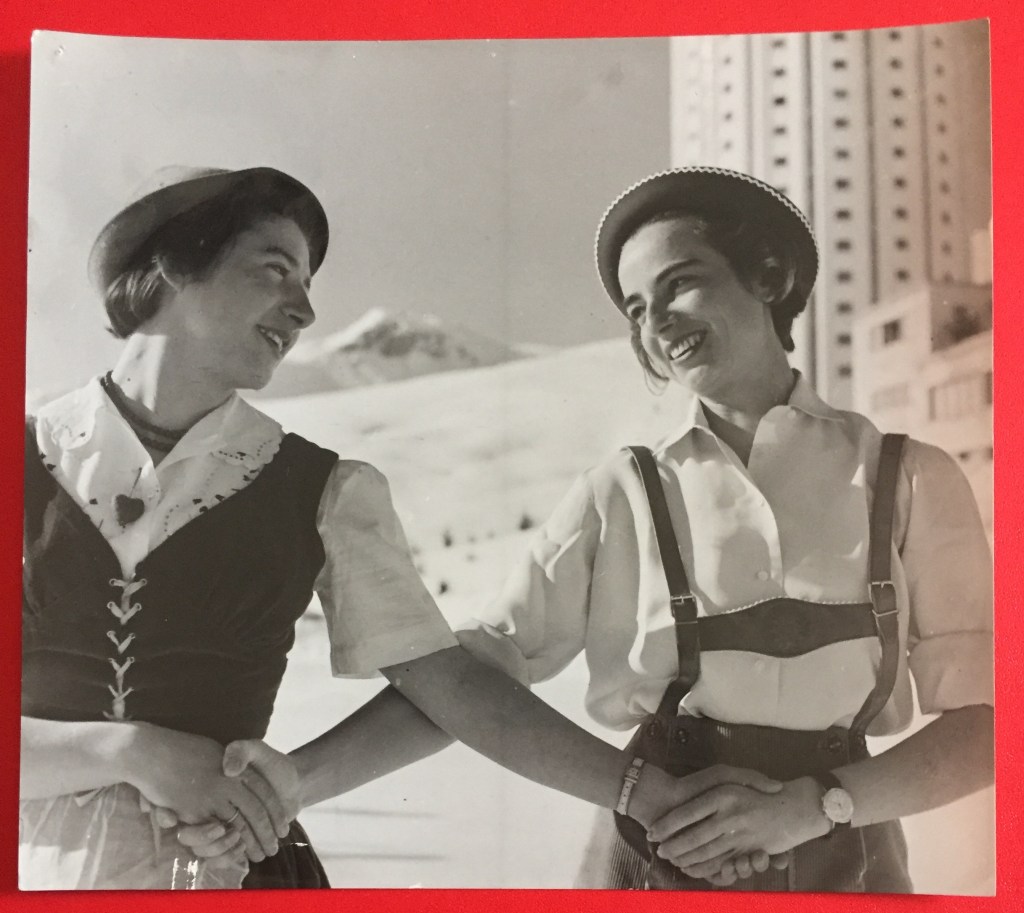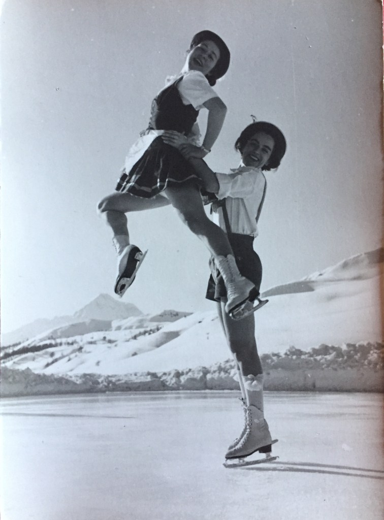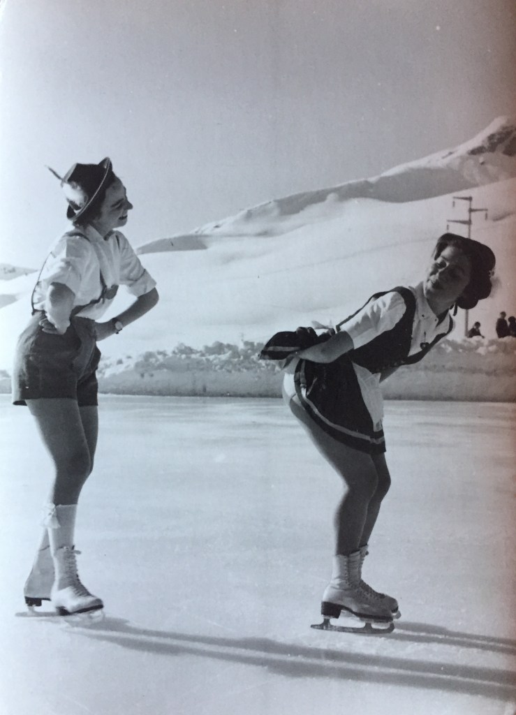 Fra le fotografie inedite, una che possiamo senza dubbio datare e localizzare. Siamo a Seefeld in Tirol, nel 1942, durante il ritiro delle pattinatrici guidate da Thea Frenssen. Quello che vediamo è il backstage della fotografia ApGrBa, I.36.1: Giovanna Boccalini Barcellona (al centro), ride, mentre la donna a sinistra sta scattando foto alle spalle di Thea Frenssen, in pelliccia maculata.