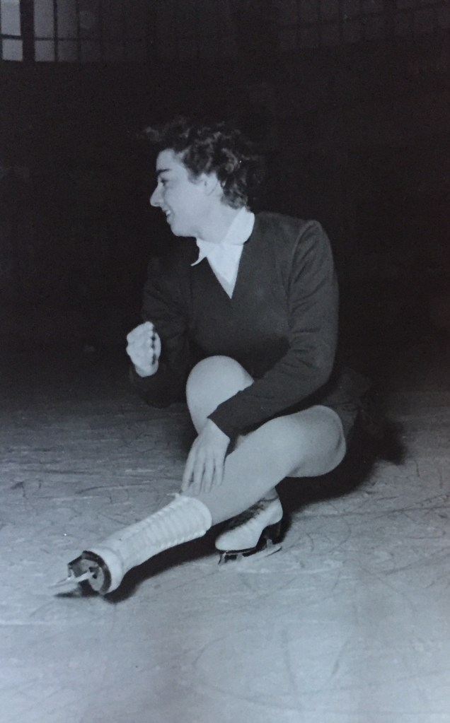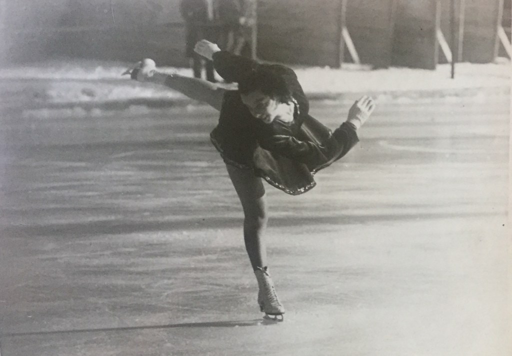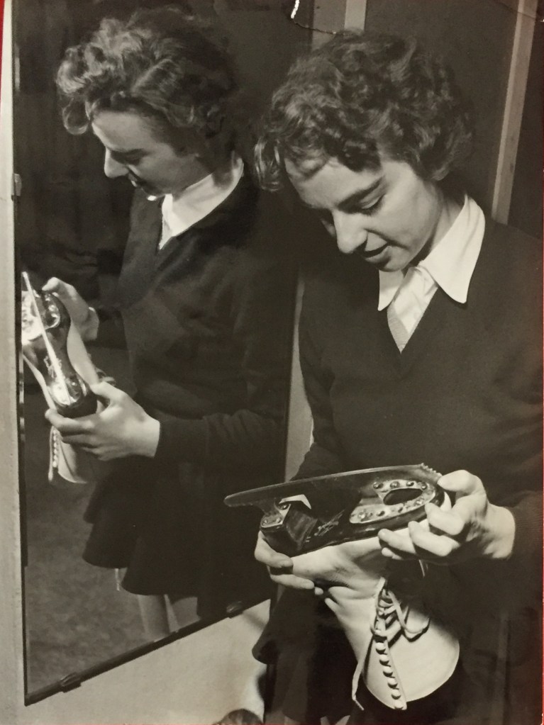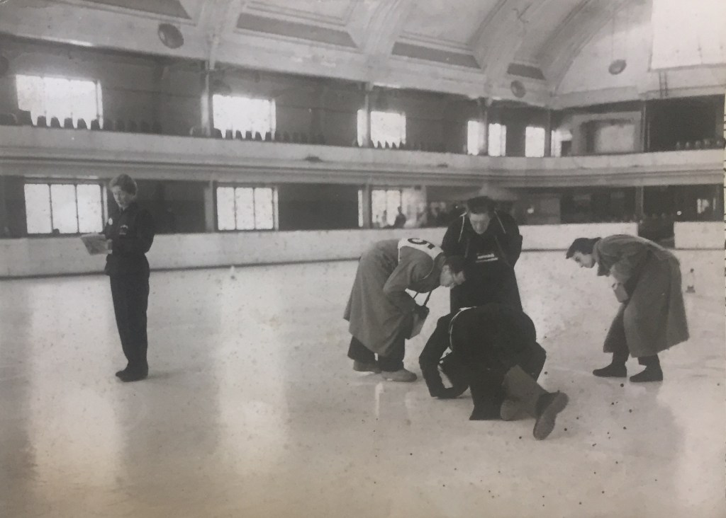 La foto 708, tratta dalla cartelletta dedicata ai Campionati Europei di pattinaggio di Mosca 1965, immortala Grazia Barcellona all’opera come giudice, mentre ispeziona coi colleghi i segni lasciati dalle lame delle pattinatrici alla fine delle figure obbligatorie.