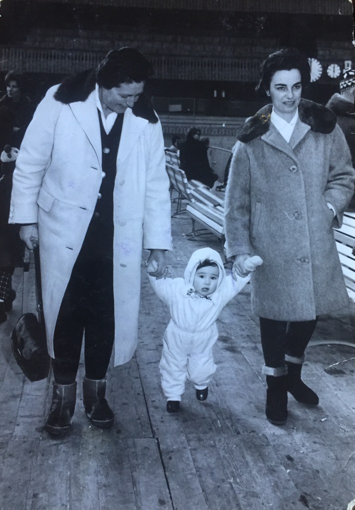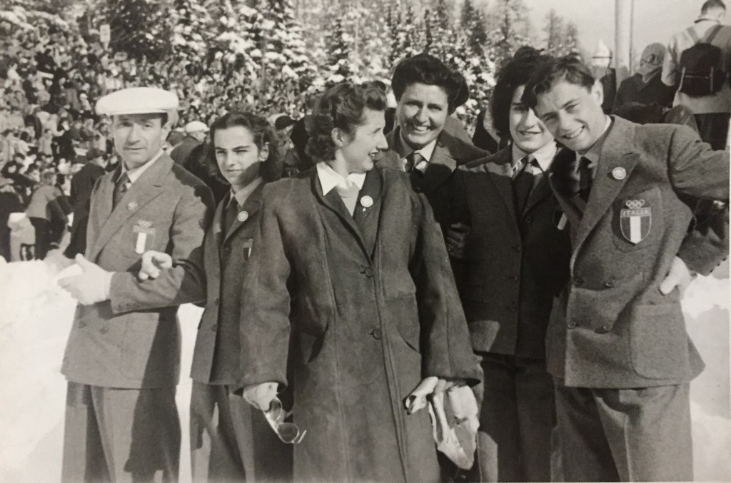 Da sinistra: un dirigente italiano; Grazia Barcellona; Costanza “Ciacia” Vigorelli; Anna Dubini Cattaneo; un’atleta azzurra; Carlo Fassi.