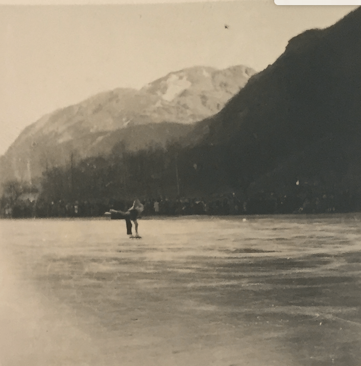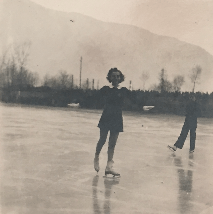 La foto 878 immortala Grazia mentre pattina a Masnago, nel gennaio 1945. La località non è chiara, visto che il comune di Masnago (Varese) non è sul Lago di Varese, il quale non potrebbe comunque ghiacciare. Potrebbe trattarsi di un laghetto all’interno del Parco Mantegazza di Varese, all’interno del quale si trova il Castello di Masnago. Grazia indossa lo stesso maglioncino bianco su gonna scura di ApGrBa I.46.3-5. Visto che in una delle tre foto vediamo Grazia con suo padre Giuseppe, potrebbe essere stato lui l’autore delle foto.