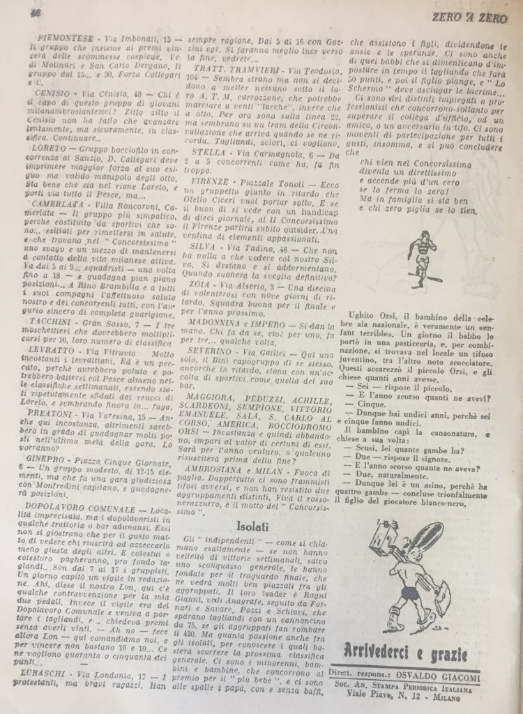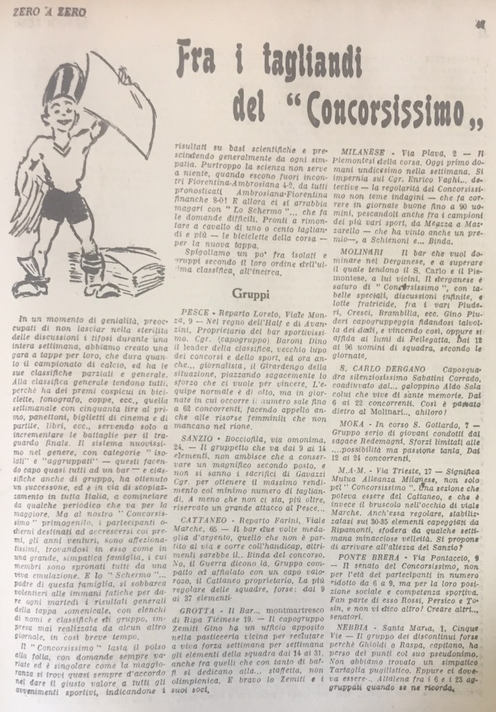 Fra i tagliandi del “Concorsissimo” è un interessante articolo, pubblicato all’interno dello SportAlmanacco 1934 (intitolato Zero a Zero) del settimanale milanese Lo Schermo Sportivo a fine 1933, di cui occupa le pp. 47-48. Contiene una sorta di mappartura dei bar sportivi della Milano dell’epoca, spesso collegati alle varie squadre dilettantistiche che prosperavano, nella città meneghina.